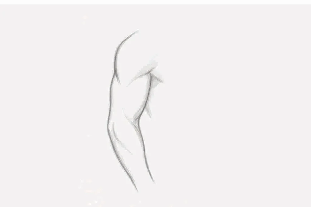 Begin with a light oval or a long vertical cylinder to represent the upper arm. This form goes from the shoulder to the elbow. Keep your strokes light and simple—this is just your construction line.